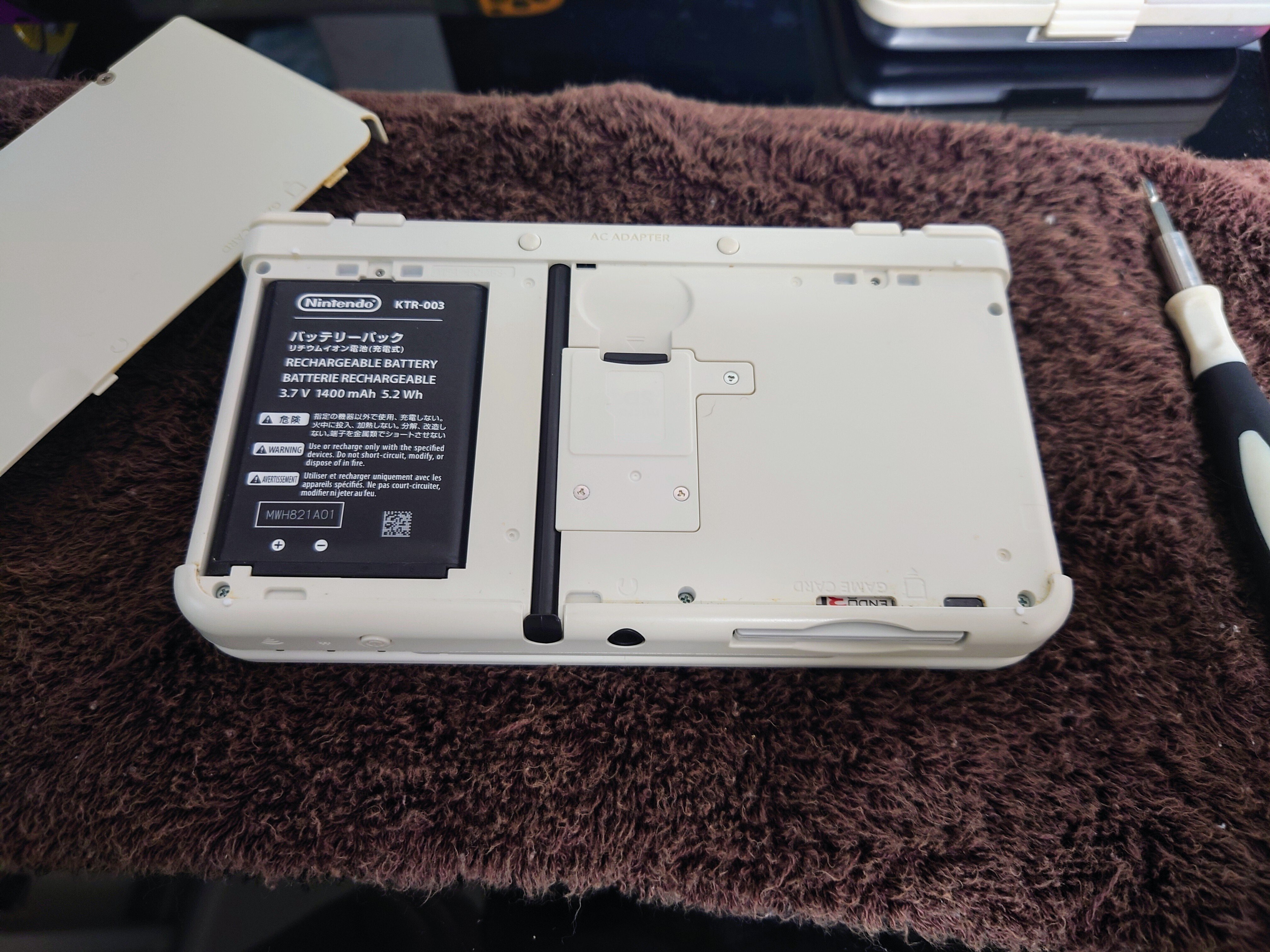 New 3DSの着せ替えカバーを外すとバッテリーパックが露わになり、バッテリーを入れ替え、ねじを締めるだけで修理は完了します。